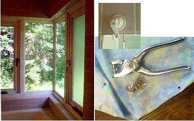 まず近所のホームセンターで、1m800円の120cm巾の塩化ビニールを購入。田舎の事とて柄など選びようもない。塩ビは青か緑の花柄のみ。この塩ビの端を二つ折りにしてハトメを打ち(ハトメパンチで簡単に)、高さ140cmの幅120cmのカーテンを2枚(窓の幅240cm)作りました。ハトメにリングを通し、そのリングを棹に通して、受けに載せるだけ。タイルなので、受けは写真の吸盤フック。